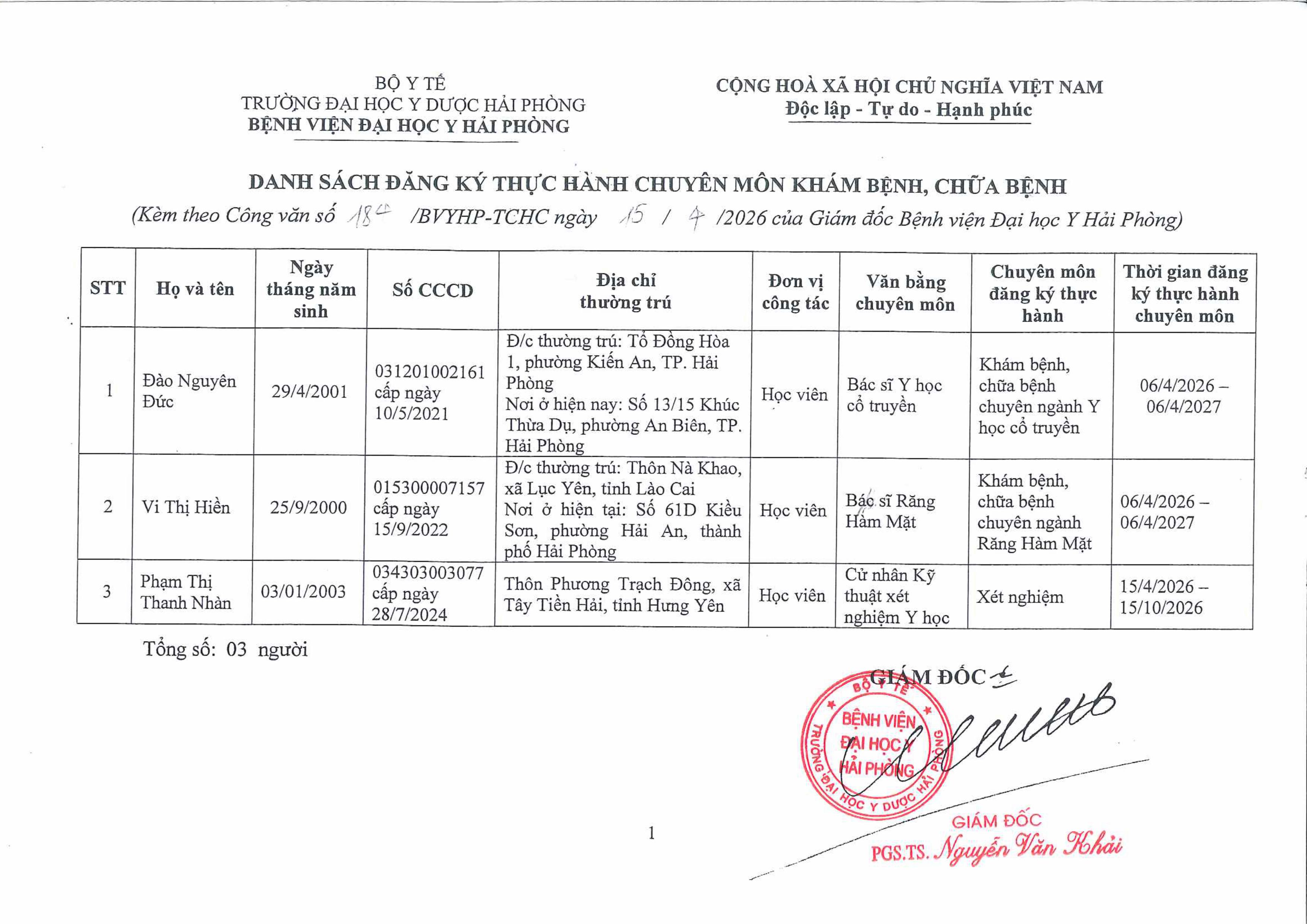 Báo cáo học viên thực hành tại Bệnh viện Đại Học Y Hải Phòng đến ngày 30.3.2026
