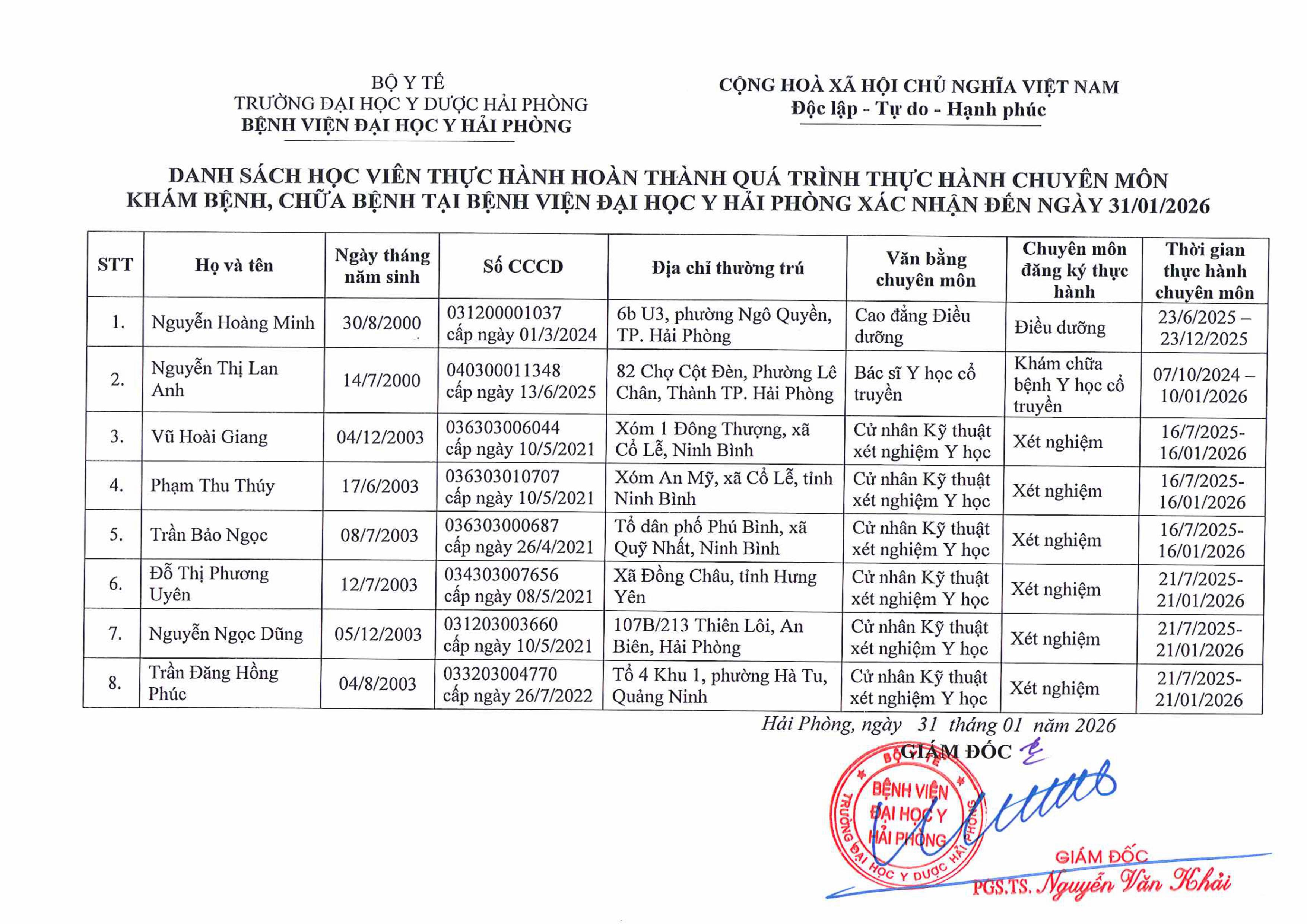 Danh sách học viên hoàn thành quá trình thực hành chuyên môn đến ngày 31.01.2026