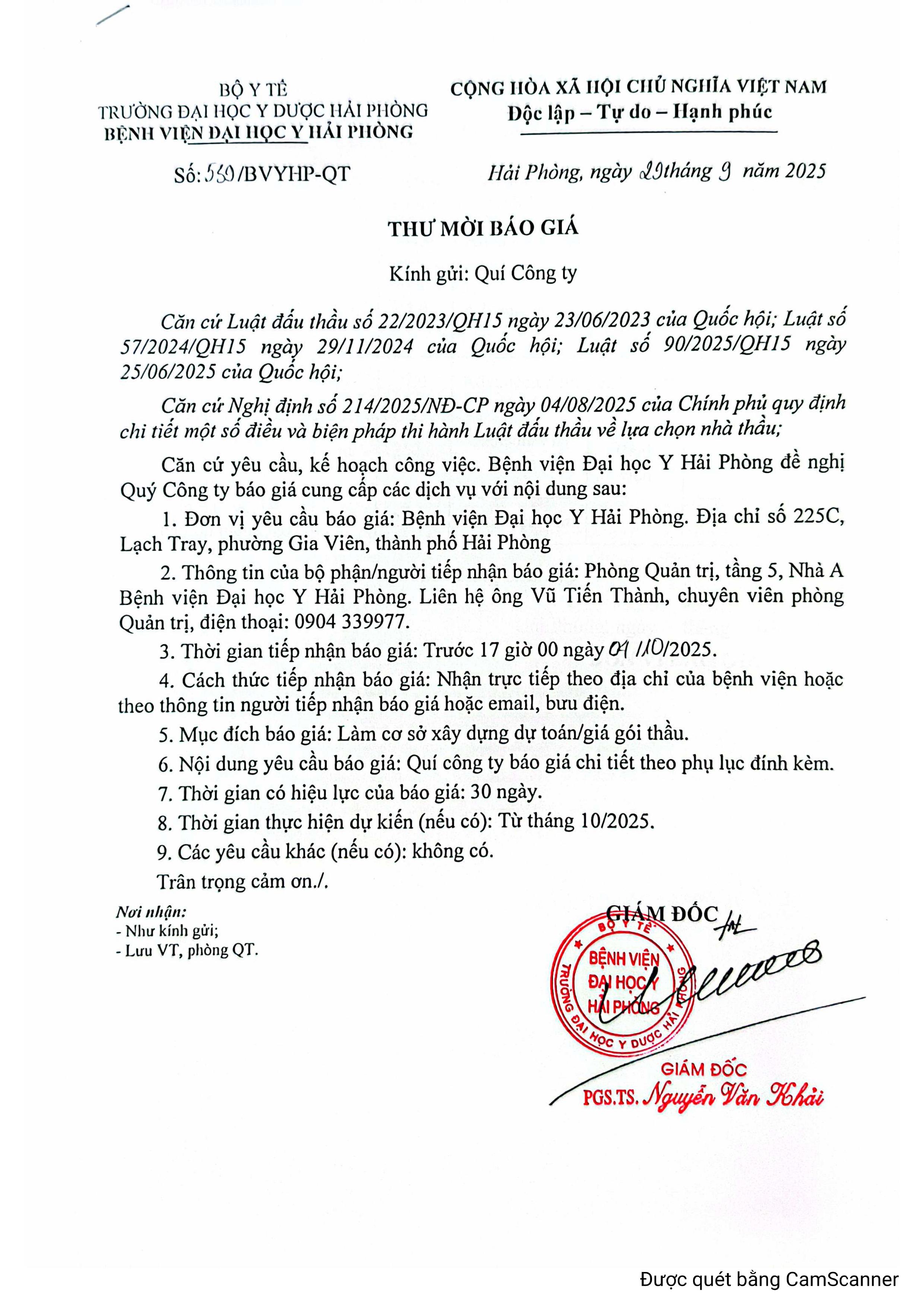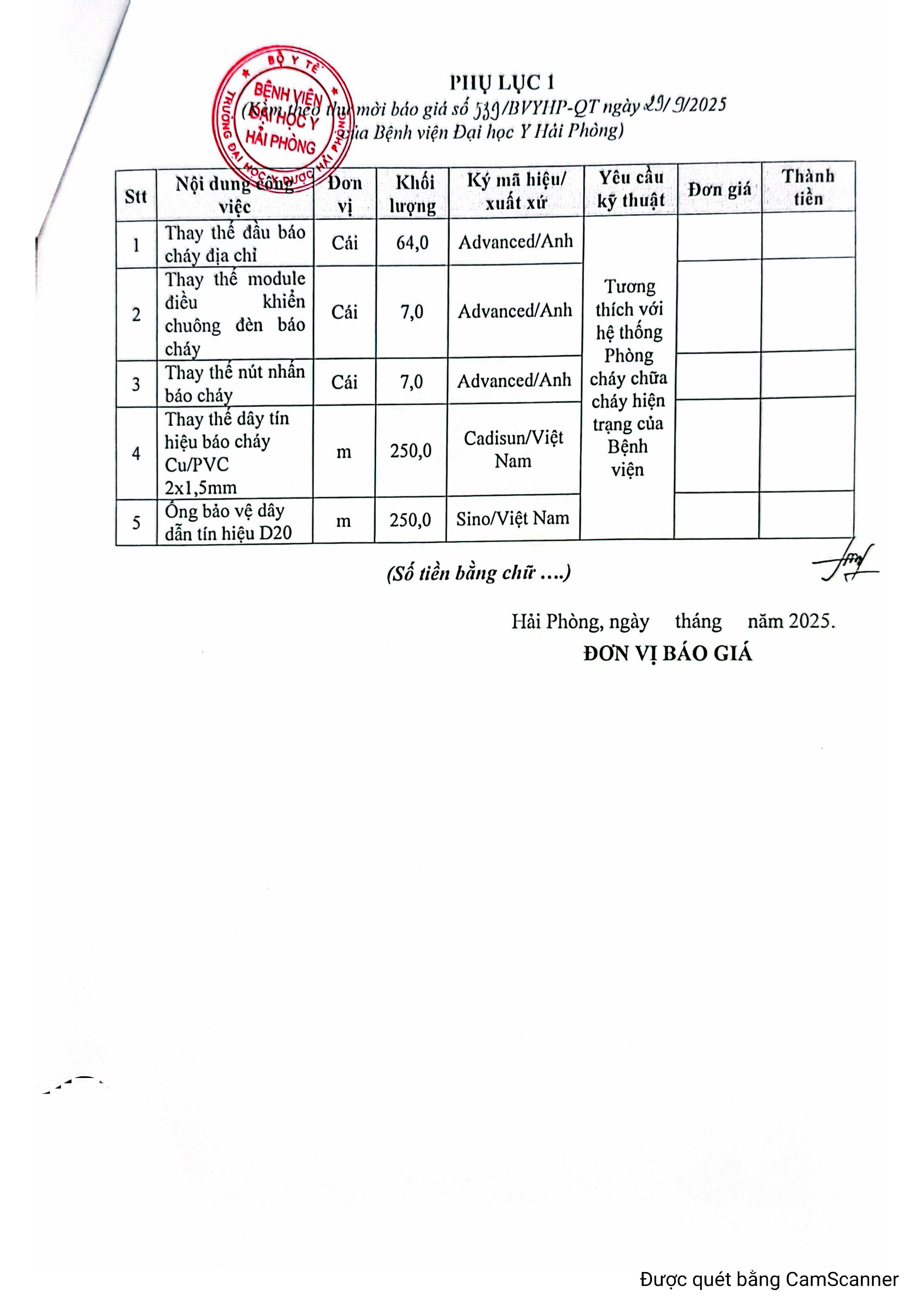 Thư mời báo giá thay thế thiết bị của hệ thống phòng cháy chữa cháy