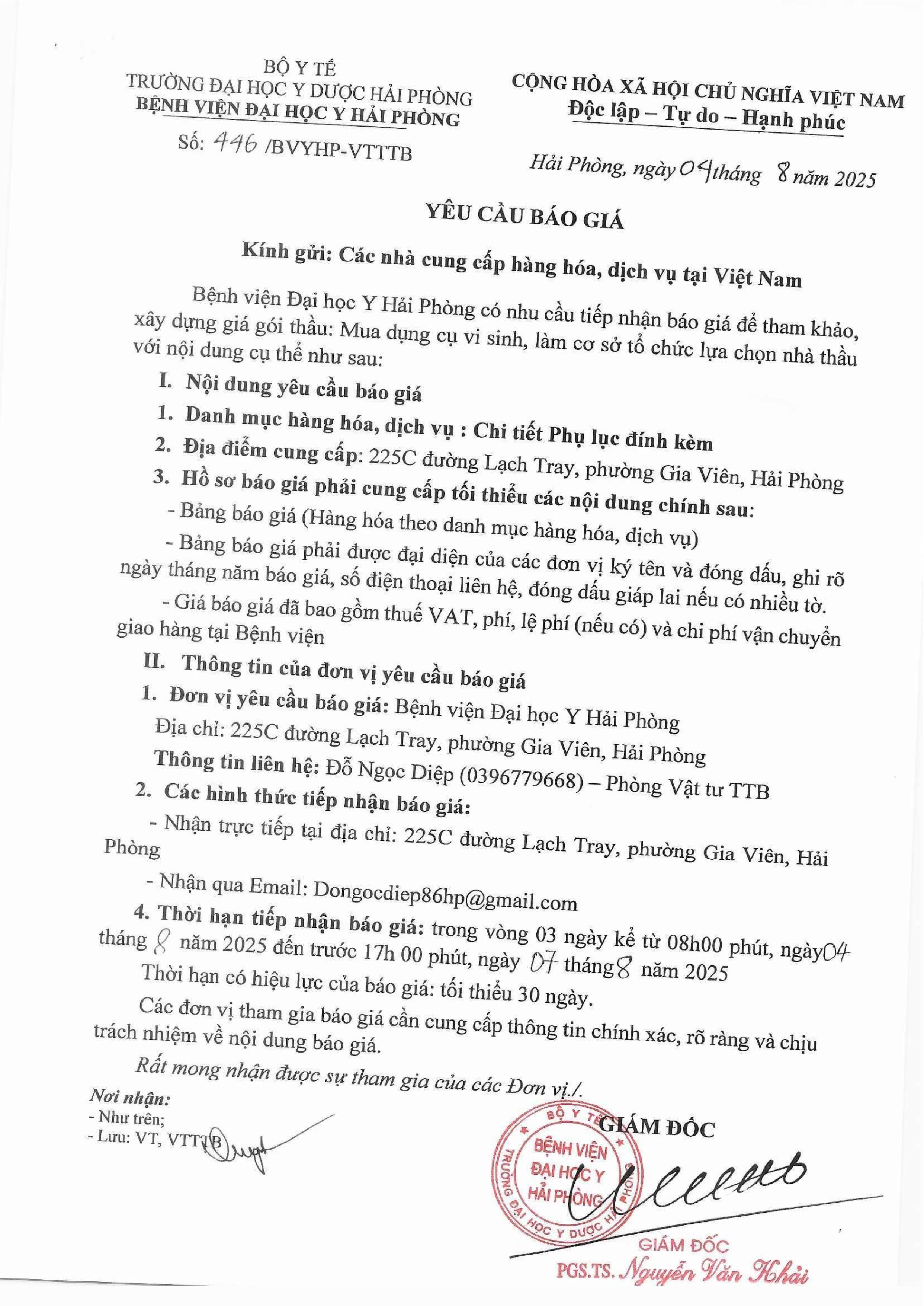Thư mời báo giá mua dụng cụ , trang thiết bị Bệnh Viện Đại Học Y Hải Phòng