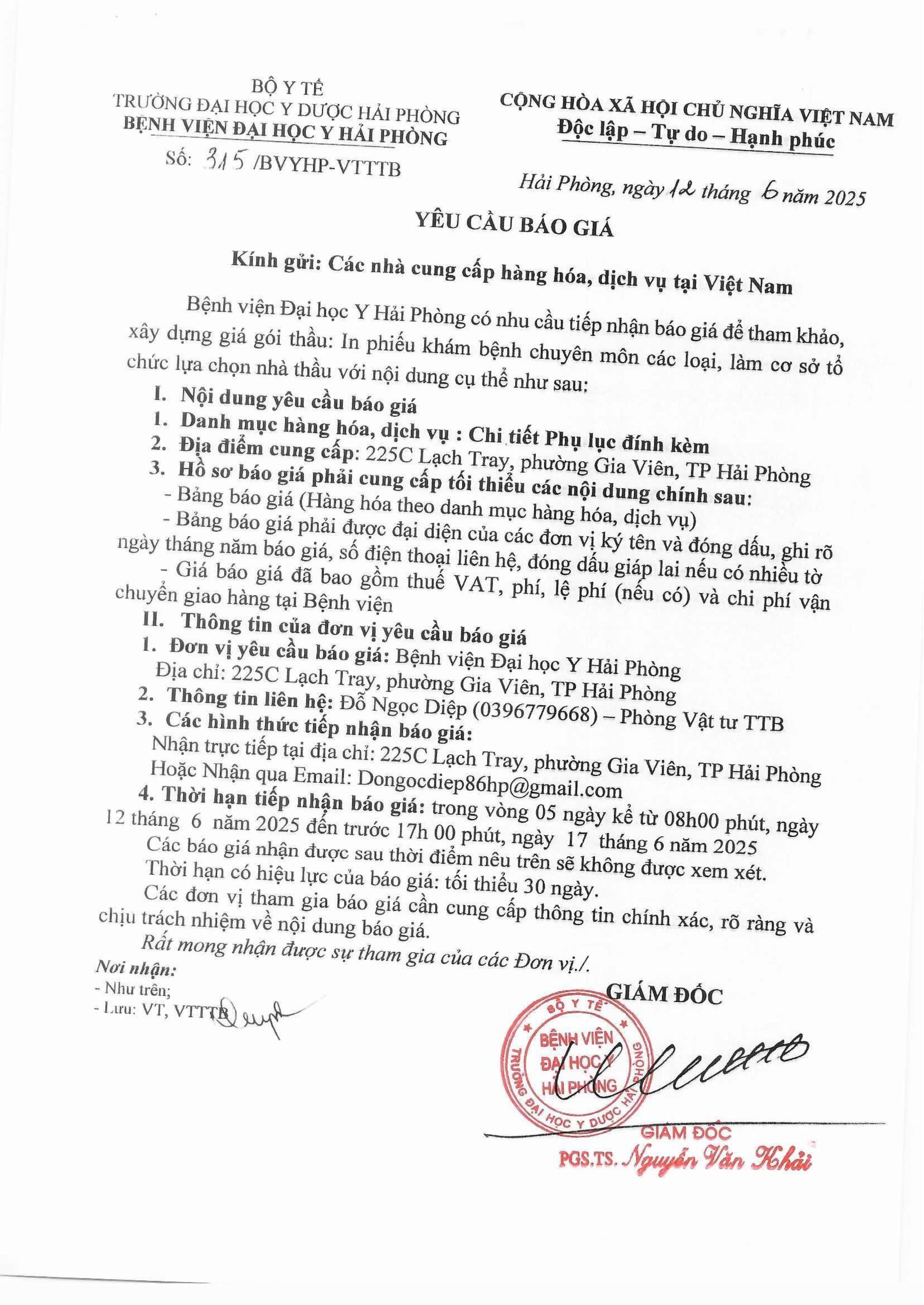 Thư mời báo giá mua dụng cụ , trang thiết bị Bệnh Viện Đại Học Y Hải Phòng