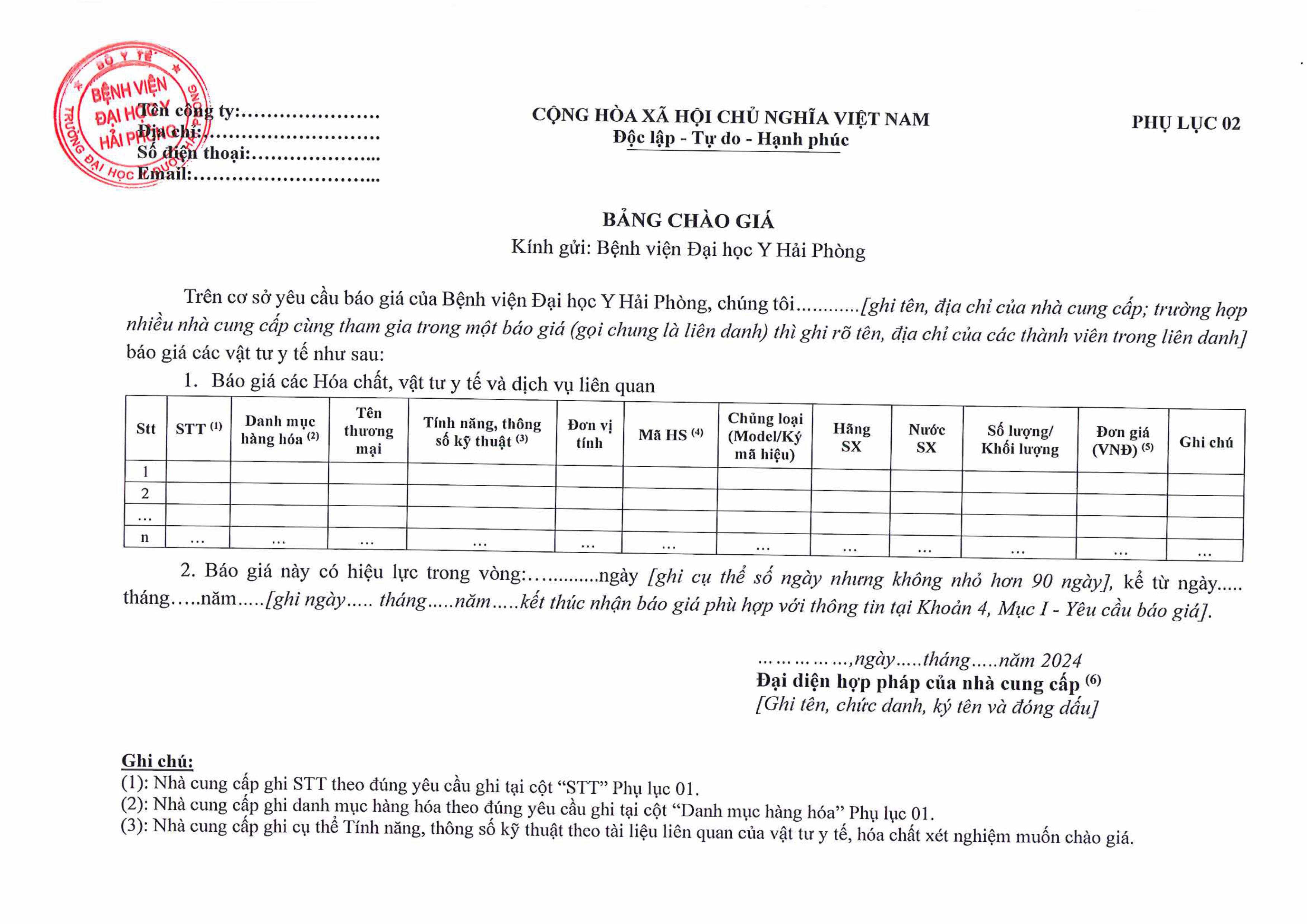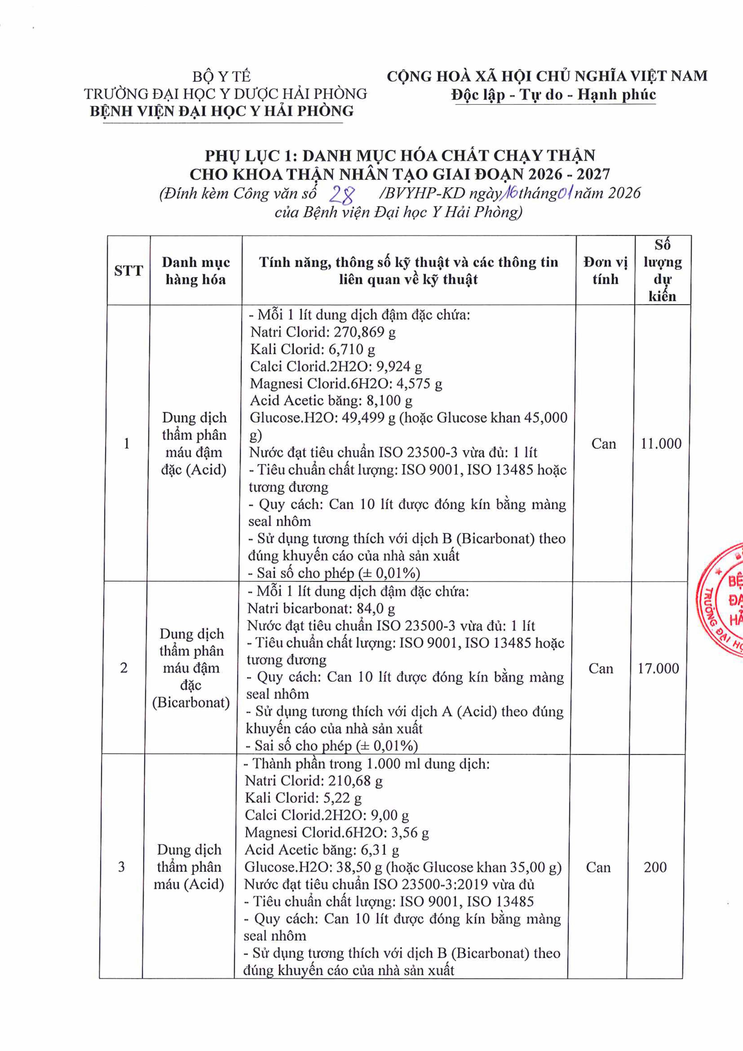 Thư mời báo giá hoá chất chạy thận cho Khoa Thận Nhân Tạo giai đoạn 2026-2027
