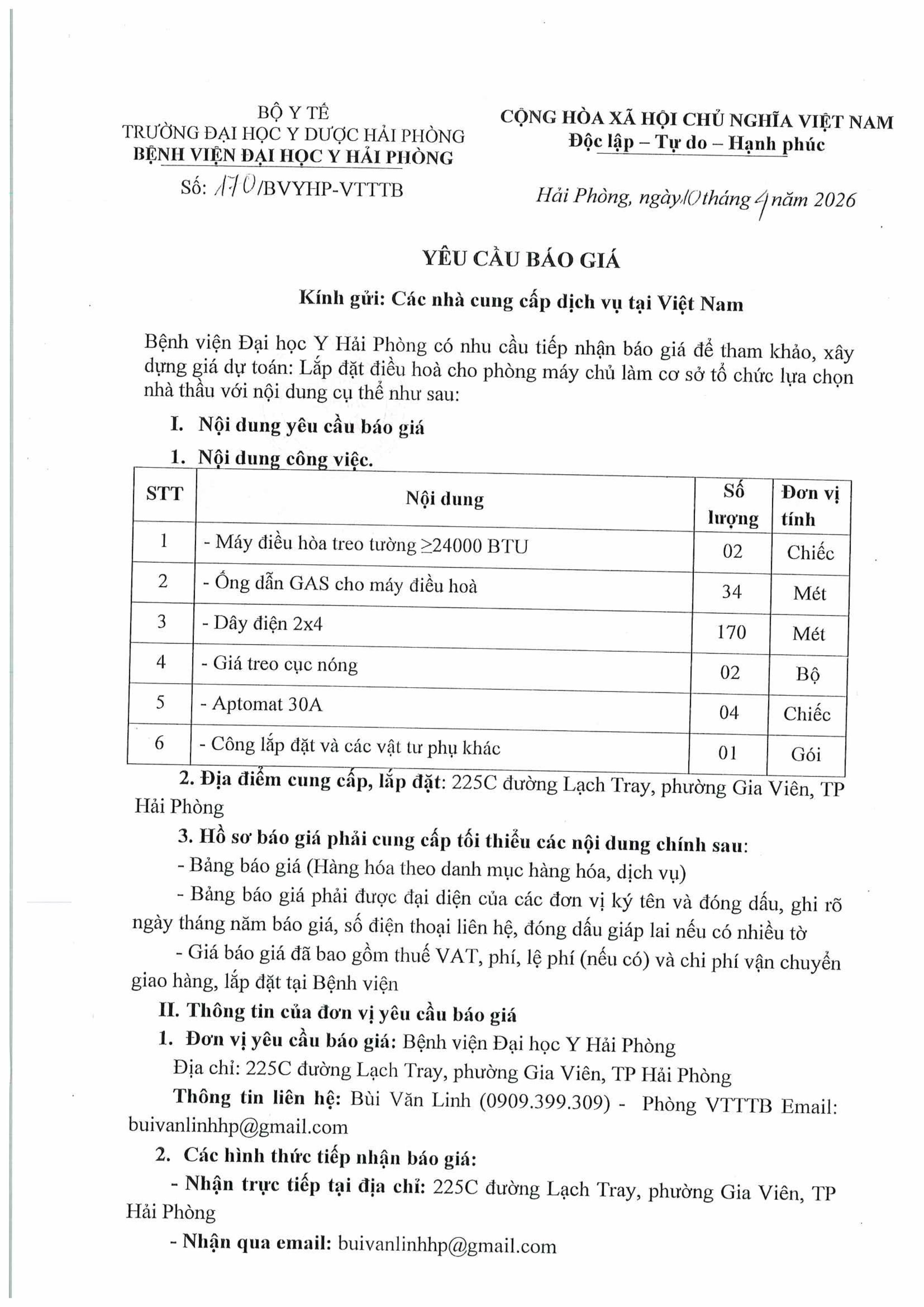 Thư mời báo giá lắp đặt điều hoà phòng máy chủ Bệnh Viện Đại Học Y Hải Phòng