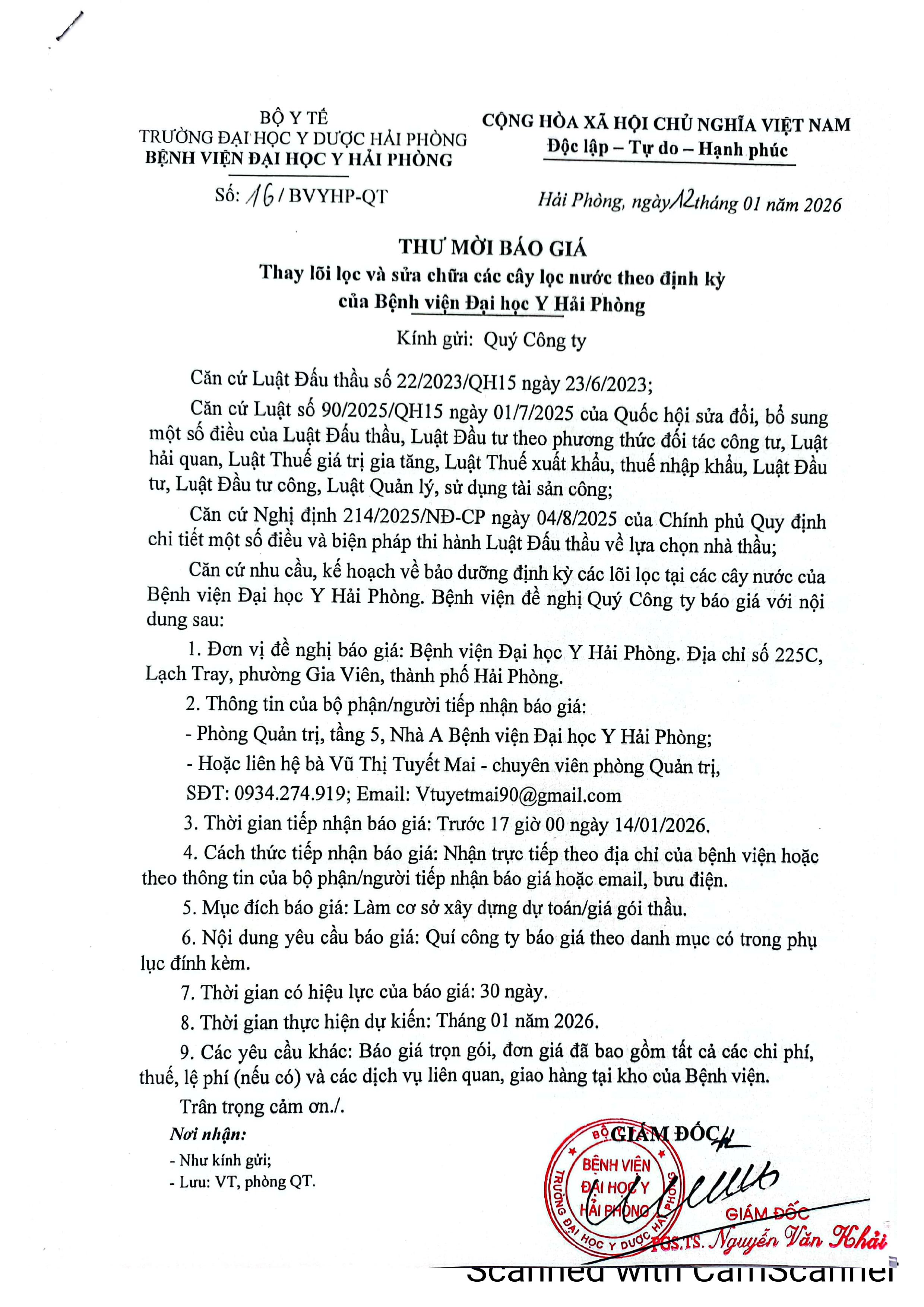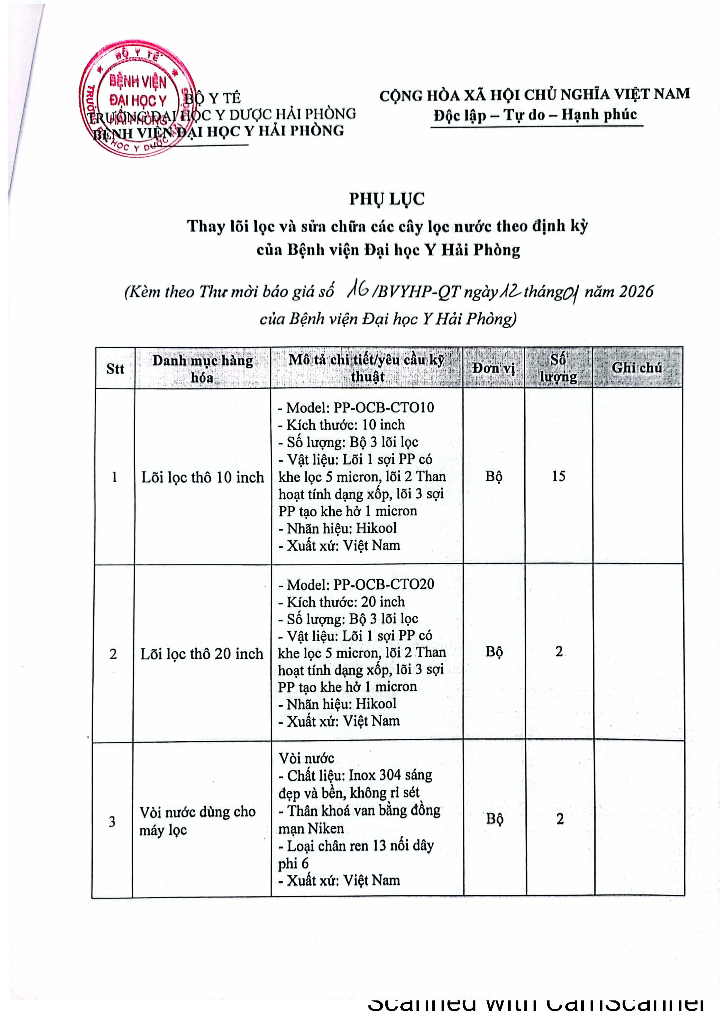 Thư mời báo giá thay lõi lọc và sửa chữa các cây lọc nước định kỳ Bệnh viện Đại Học Y Hải Phòng