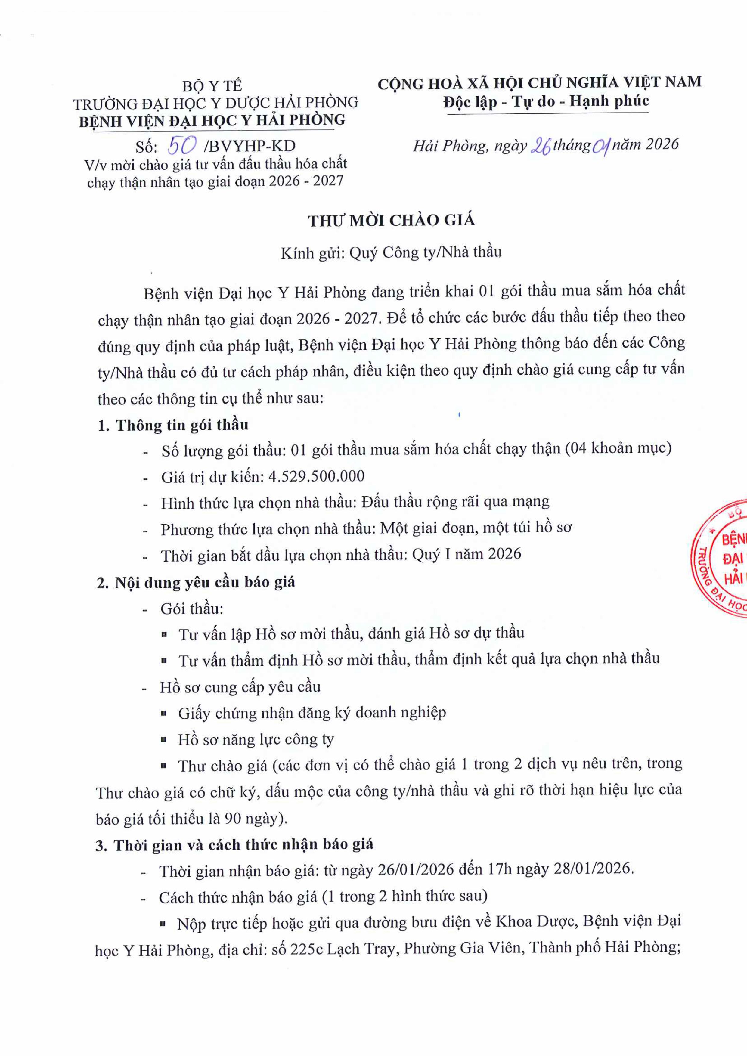 Thư mời báo giá hoá chất chạy thận cho Khoa Thận Nhân Tạo giai đoạn 2026-2027