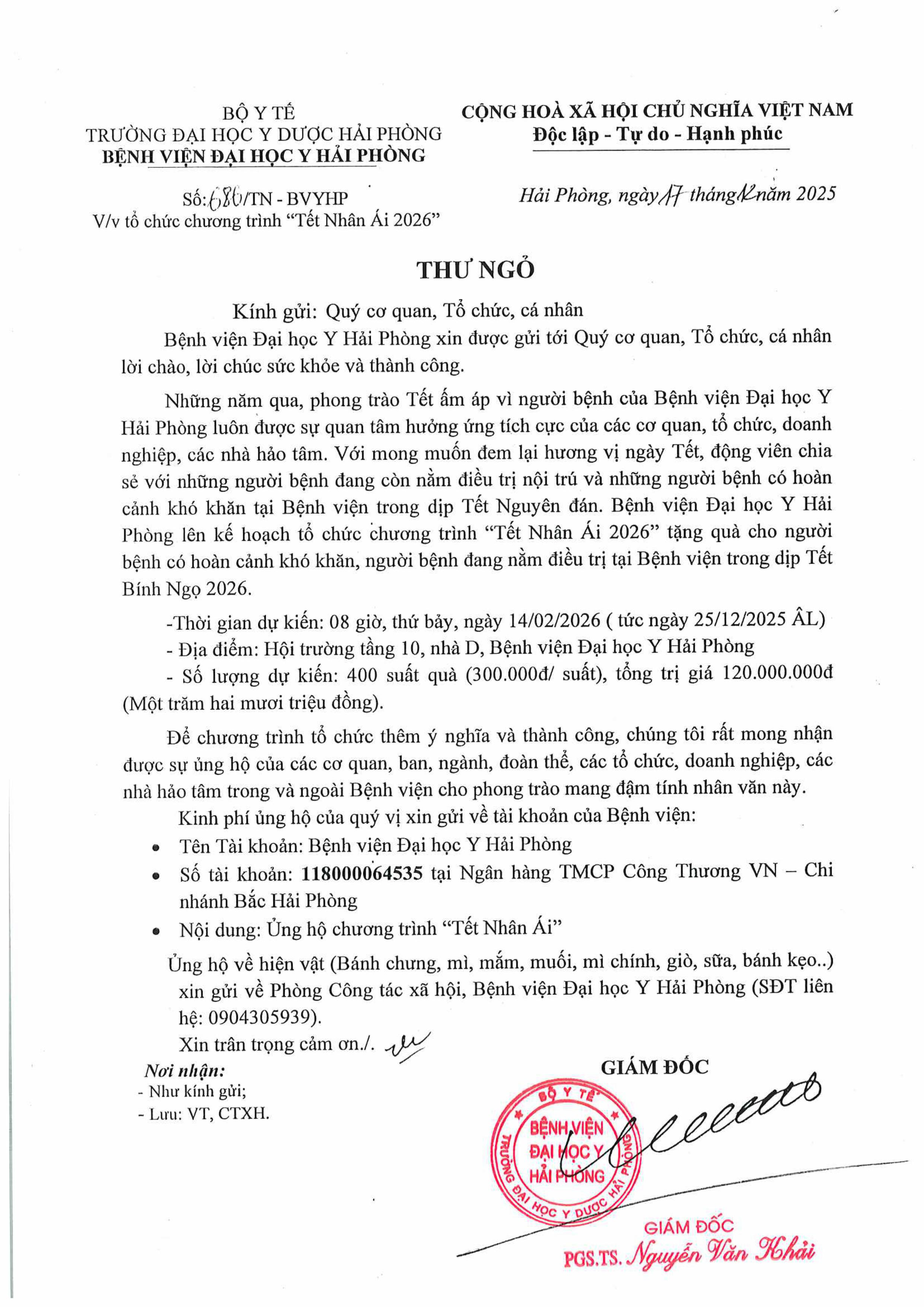 Thông qua chương trình “Tết Nhân Ái 2026”, Bệnh viện Đại học Y Hải Phòng mong muốn mang đến:Những phần quà Tết ý nghĩa; Sự động viên tinh thần kịp thời; Niềm tin, hy vọng về một mùa xuân ấm áp, tràn đầy yêu thương; Kêu gọi sự đồng hành của cộng đồng