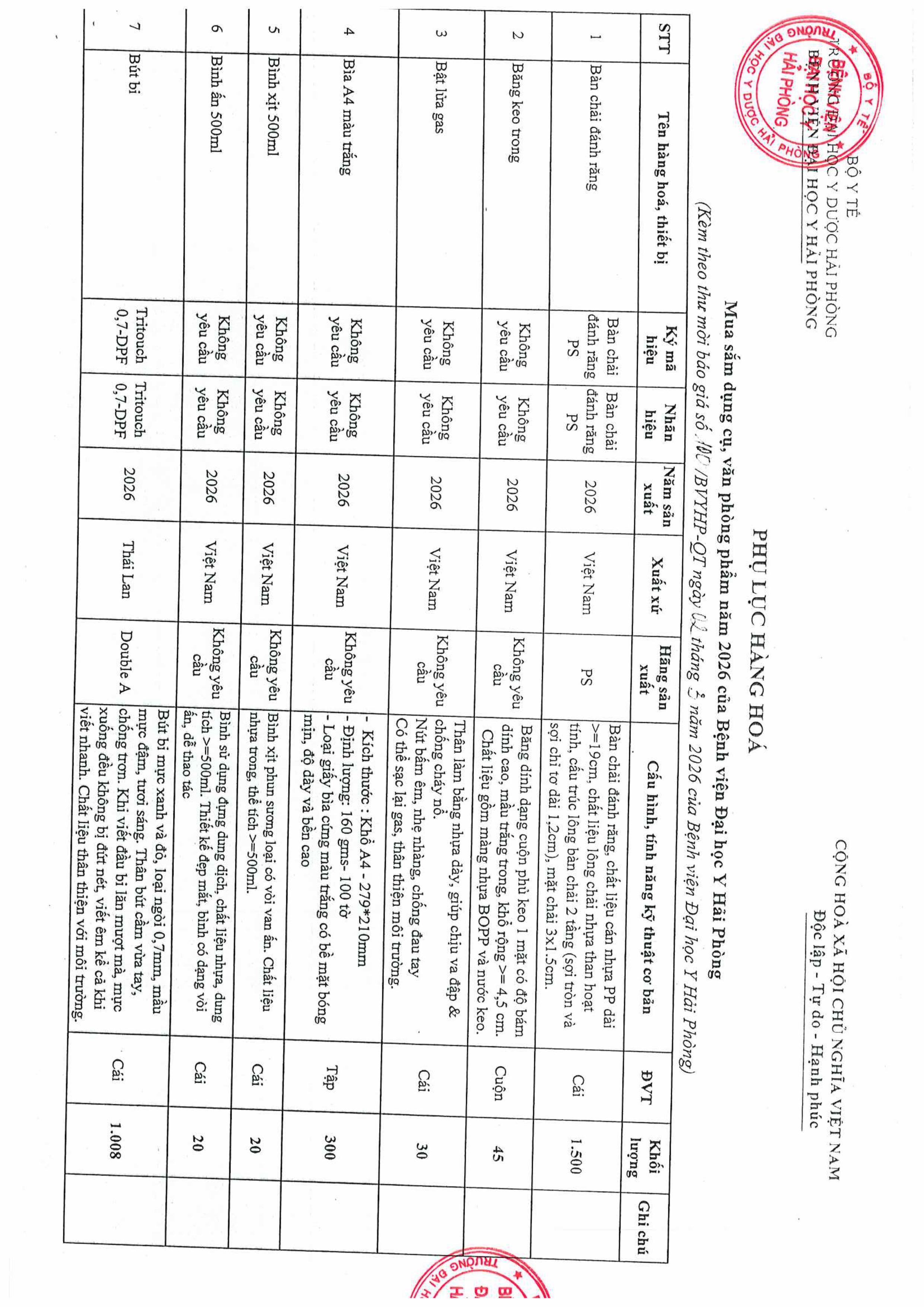 Thư mời báo giá mua dụng cụ , trang thiết bị Bệnh Viện Đại Học Y Hải Phòng